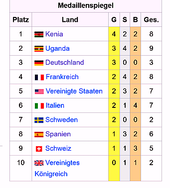 Die meisten Medaillen gingen an UGA 9 - FRA 9 - Kenia 8 - USA 7 - ITA 7 - ESP 6 -