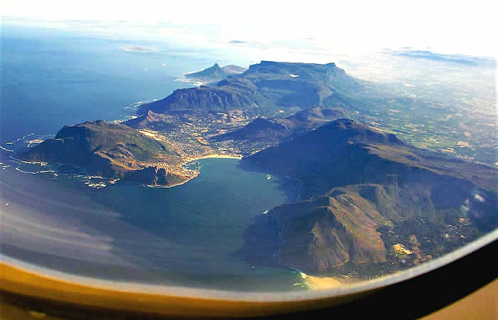 | Das ist die gesamte Gebirgskette um Kapstadt, in der Mitte, oben (flach) ist der Tafelberg. |